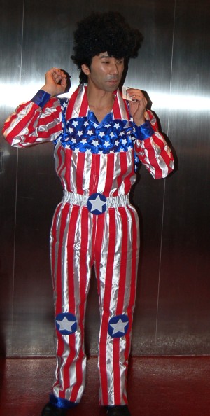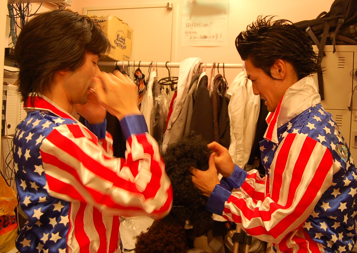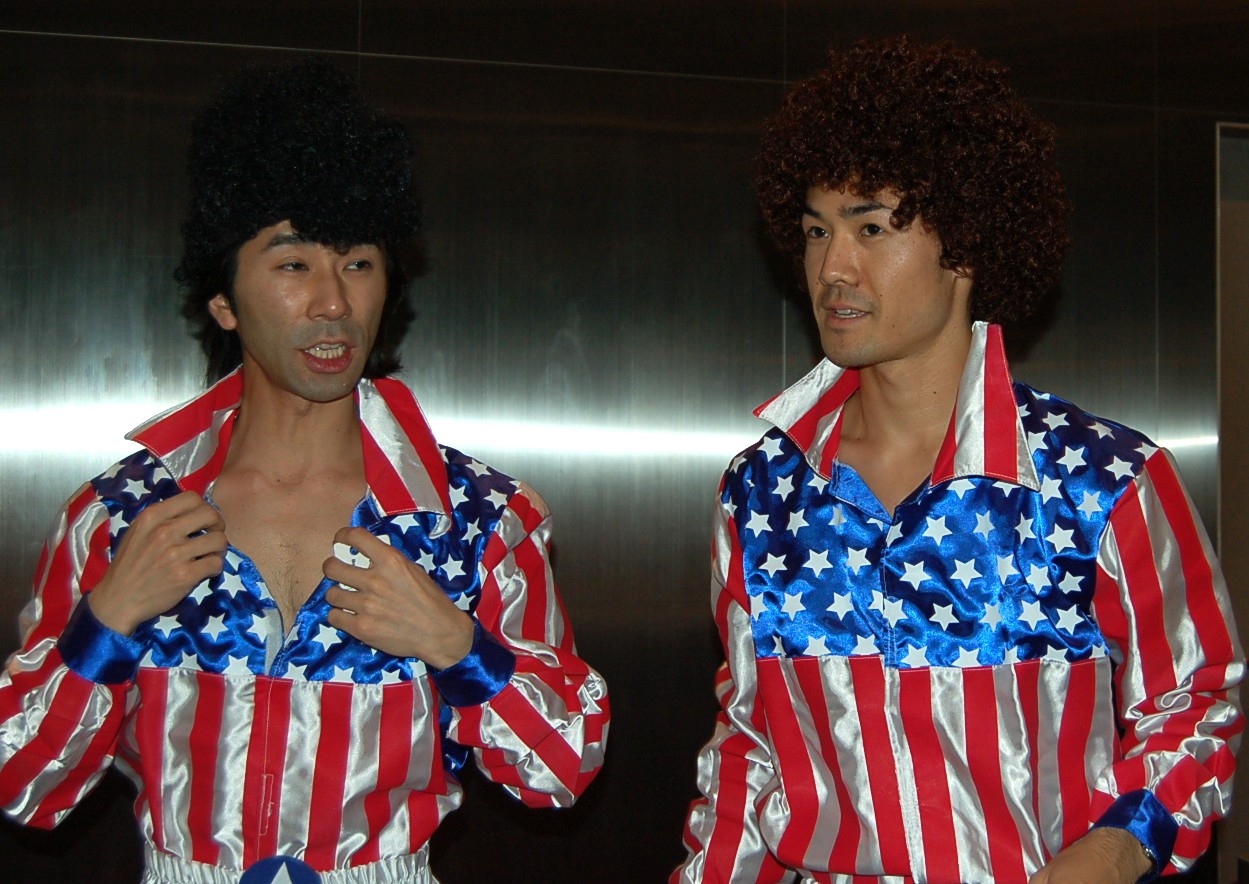 Masa & Jhon1 Dazzling Nightでは、スタッフも過激(!?)な装いで働いていました。ダズルスタッフの衣装をコーディネートしたのは、ダズルソムリエのShokoさん。それぞれのキャラに合いすぎの衣装を見つけてきました!!!その中でもかなり目立っていたペアルックの2人がダズルマネージャーのJohnさんとバーテンダーのMASA。かなりアメリカンです。しかも普通に似合ってます。  着替える前(上写真)そして着替えた後!! Masa & Jhon2
