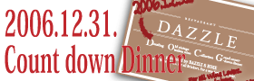 そして、ワインはDAZZLEが持っているオールドヴィンテージワインを惜しげもなく出してしまいます。60年代・70年代物など、私が生まれる前からのワインがザクザク…。180本もあるので、このヴィンテージワイン達が飲み放題です(おぉぉ!) あと2日で12月!ホント早いですねぇ。今年の2006年は、ダズルとリゴレットがオープンしてHUGEが本格的に動き出した記念すべき年でした。きっと一生忘れない年になるんだろうなぁー。今までの年とは内容の濃さが格段に違一年でした。 カウントダウンディナーのご予約、受付中です!皆様のお越しをお待ちしています♪ ————- ■DAZZLEカウントダウンディナー 2006年12月31日(SUN)  20:00 Door Open  ¥20000/お一人様 イタリアンオールドヴィンテージワイン飲み放題 & New Year’s eve限定コース 【ご予約受付中!】 restaurant DAZZLE レストラン ダズル【銀座】東京都中央区銀座2-4-12ミキモトギンザ2 8F/9F TEL:03-5159-0991 FAX:03-5159-0992 ————-