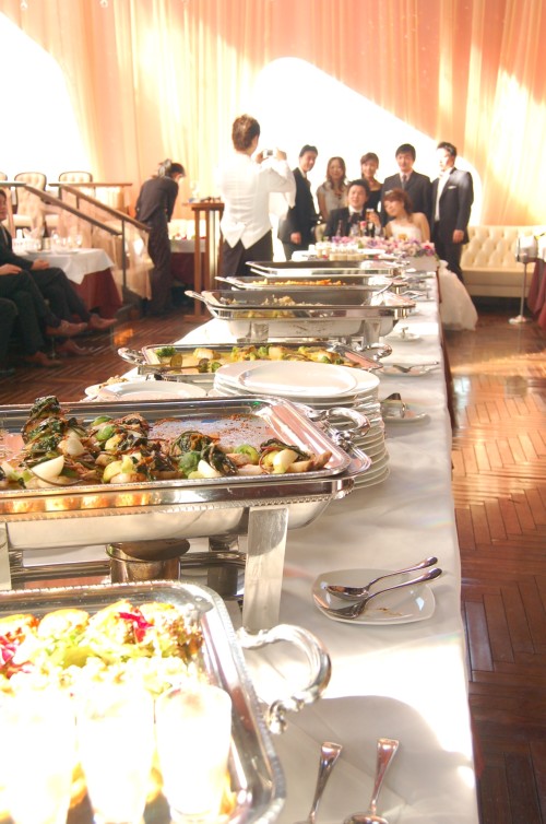 ダズルのメインダイニング中央に、料理を並べ、窓際に新郎新婦の高砂を。ゲストの皆さんは自由に動き回って、お料理を楽しんだり、話をしたりと、いつもとは一味違うウエディングパーティーとなりました。こんな特別なプランにも対応します◎ ダズルでのレストランウエディングは、ウエディングサロンもありますので、是非ご相談下さいね♪