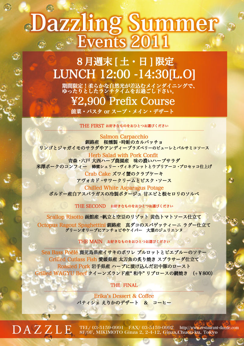 8月の週末[土・日]は、銀座・DAZZLE(ダズル)がランチ営業をします!